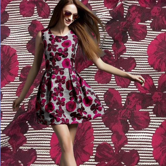 提花織物是直接把花紋織在布料中,用不同顏色的經(jīng)紗和緯紗相互交錯(cuò)搭織、交織沉浮,從而形成不同花色的圖案。提花面料可分梭織、經(jīng)編提花和緯編提花。緯編織物橫、縱向具有很好的彈性,經(jīng)編和梭織提花沒(méi)有彈性。提花織物質(zhì)地細(xì)膩、爽滑,光澤度好、手感佳、懸垂性及透氣性好,色牢度高(紗線染色),使用起來(lái)不變形,不褪色,舒適感好,相比較印花、繡花面料,提花工藝更復(fù)雜,造價(jià)成本更高。